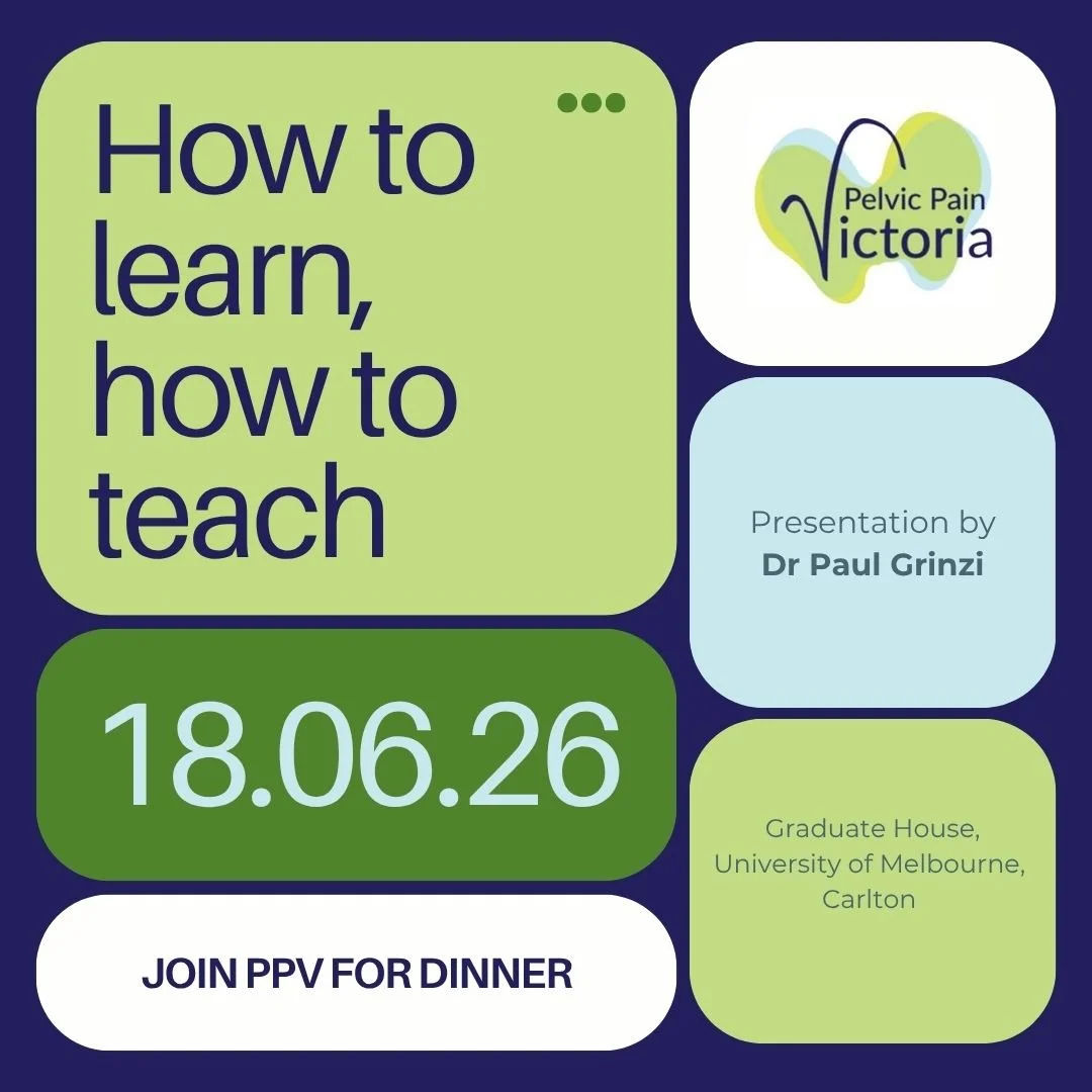 Pelvic Pain Victoria is hosting a two-course dinner, with a wonderful speaker with decades of experience in the clinical and teaching space. Dr Paul Grinzi, a General Practitioner, RACGP educator and a faculty member of The Teaching Course, will be sharing with us his presentation on How to learn, How to teach.